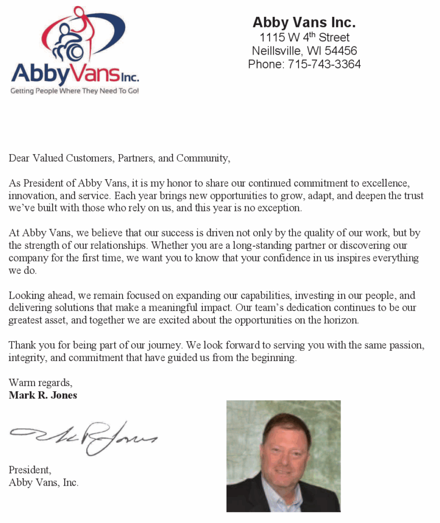 Abby Vans Inc, an established transportation service, has been proudly providing non-emergency, specialized transportation to elderly and disabled individuals throughout Wisconsin since 1988.